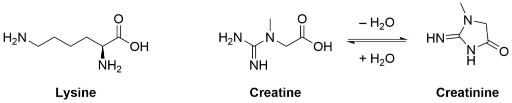 The name creatine, and from this creatinine, was derived from the Greek word kreas, meaning meat, denoting its isolation from skeletal muscle. By analogy, Dreschel suggested to call his possible homologue either lysatine or lysatinine, where the “lys-“ prefix presumably denotes the isolation by hydrolysis of protein (the term ‘hydrolyse’ was definitely pre-existing as it is used later in the paper). He went on to show that urea could be produced from lysatine, which was a key property of creatine. While he was not 100% sure that creatine and lysatine were the same, he noted that his findings were still of importance to the study of metabolism.